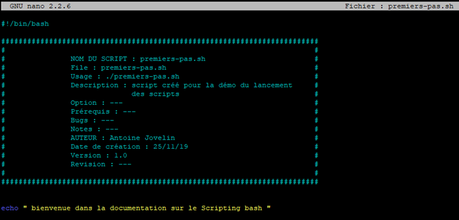 Attention : à titre informatif, j’ai personnellement l’habitude d’ajouter un en-tête qui permet d’avoir des informations sur le script lorsqu’on l’ouvre via un éditeur de texte. Ce n’est pas une obligation. Je précise également mais vous le savez déjà, le caractère « # » permet de mettre en commentaire une ligne 😉