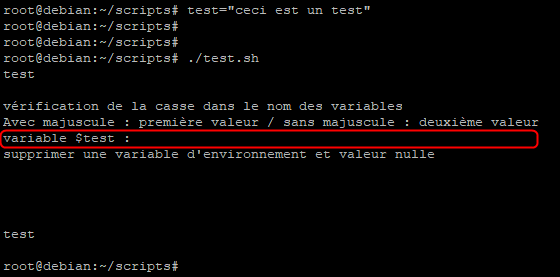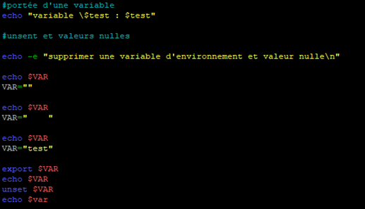 Dans un premier temps, la variable possède une valeur et va donc être affichée par la commande « echo » cependant avant le deuxième « echo » nous allons supprimer la variable et rendre son contenu nul.
