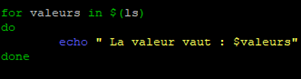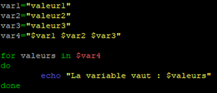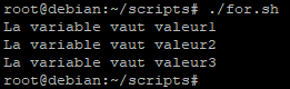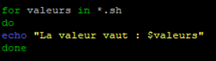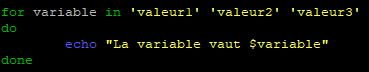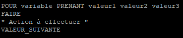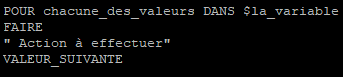 for variable in valeur1 valeur2 valeur3
