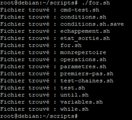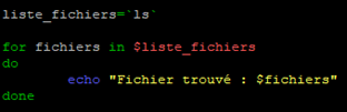 Ici le script va lire la variable qui équivaut à une commande et donc exécuter cette dernière. Puis pour chacune des valeurs retrouvées, autrement dit chacun des fichiers listés par la commande, il effectuera l’action demandée par la boucle « for ».