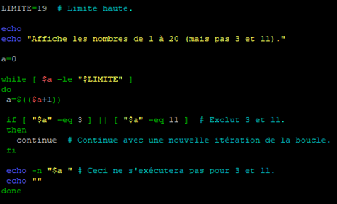 SI la valeur de la variable « $a » est égale à 3 ou 11 alors la commande « continue » sera exécutée, effectuant un saut à la prochaine répétition de la boucle et ceci sans exécuter les commandes restantes dans ce cycle particulier de la boucle.