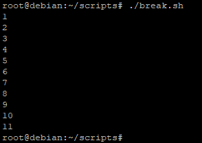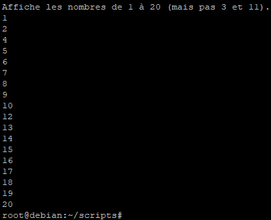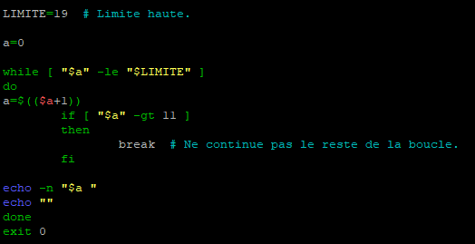Ici le script va agir de la même manière que précédemment sauf que cette fois-ci la boucle s’arrêtera lorsque la valeur sera supérieur à « 11 » et ceci sans effectuer les commandes qui auraient du l’être dans ce cycle de la boucle.
