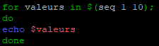 Pour rappel, ici la commande « seq » génère tous les nombres allant de 1 à 10. Chacun des résultats de cette commande sera affecté comme valeurs de la variable « $valeurs » qui sera traité par la boucle « for »