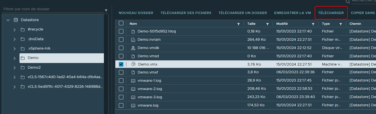 Lorsque nous sommes dans le contenu du Datasore, cliquer sur le fichier ".vmx" puis cliquer sur "Télécharger" pour récupérer le fichier sur votre ordinateur.