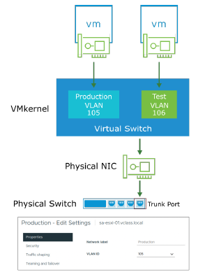 Le VMkernel gère tout le marquage (tagging) et le démarquage (untagging) des paquets lorsqu’ils traversent le virtual switch.
