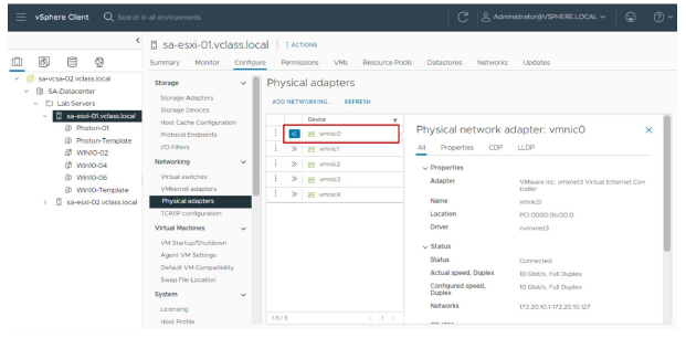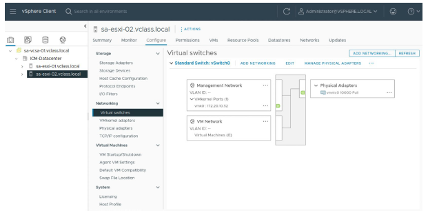La diapositive montre le standard switch, vSwitch0, sur l’ESXi host sa-esxi-01.vclass.local.