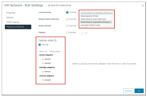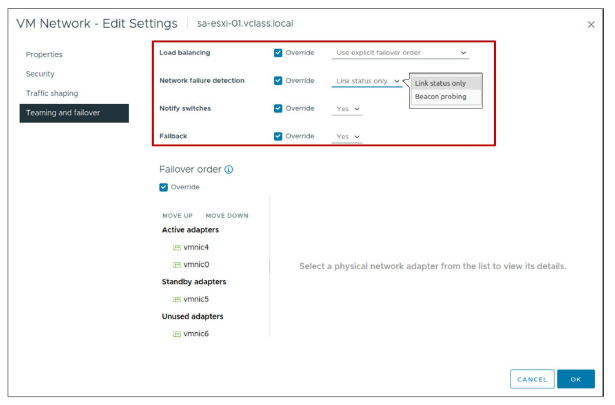 Utilisez la teaming and failover policy pour déterminer les informations suivantes :