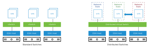 Les standard switches sont configurés au niveau de l’host. Les distributed switches sont configurés au niveau du data center, ce qui leur donne les avantages suivants :