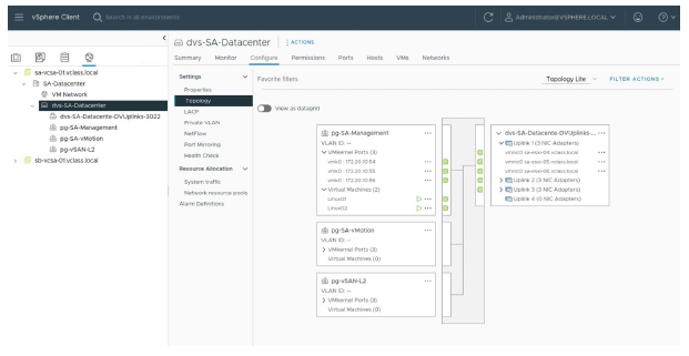 Dans le vSphere Client, vous pouvez afficher la configuration du distributed switch en utilisant le panneau Topology dans l’onglet Configure.