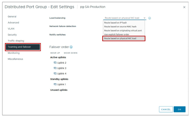Pour utiliser cette méthode, modifiez les paramètres du distributed port group, puis sélectionnez Route based on physical NIC load.