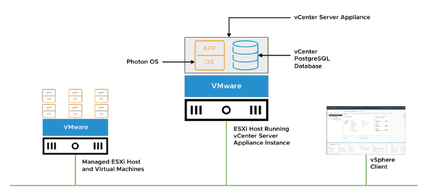 • vCenter Server Appliance utilise le système d’exploitation Photon et la base de données PostgreSQL.