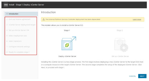 L’installation de vCenter Server Appliance est un processus en deux étapes :