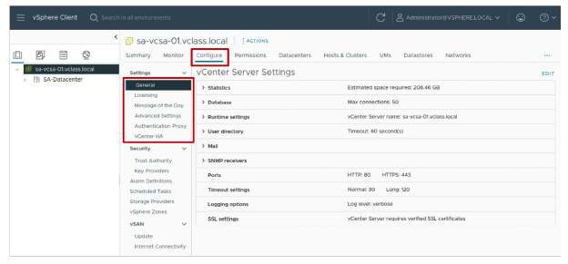 Pour accéder aux paramètres système de vCenter en utilisant le vSphere Client, sélectionnez le système vCenter dans le panneau de navigation, cliquez sur l’onglet Configure, puis développez Settings.