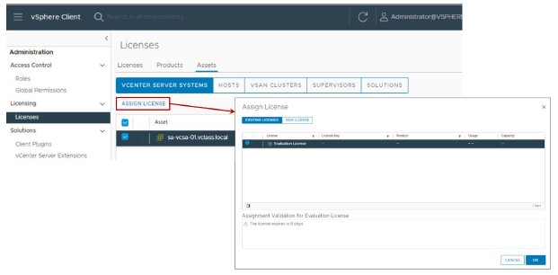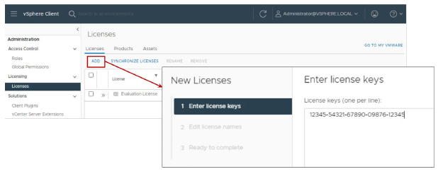 Dans le vSphere Client, depuis le menu principal, sélectionnez : Administration > Licences pour ouvrir le volet Licences.