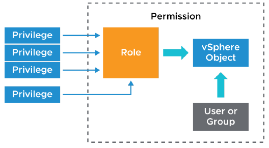 Souvent, vous appliquez une permission à un objet de l’inventaire vCenter, comme un ESXi host ou une VM. Lorsque vous appliquez une permission, vous spécifiez qu’un utilisateur ou un groupe dispose d’un ensemble de privileges, appelé un role, sur cet objet.