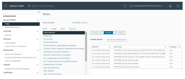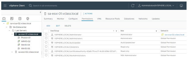 Pour plus d’informations sur l’héritage hiérarchique des permissions et les permissions globales, consultez vSphere Security à l’adresse : https://docs.vmware.com/en/VMware-vSphere/index.html
