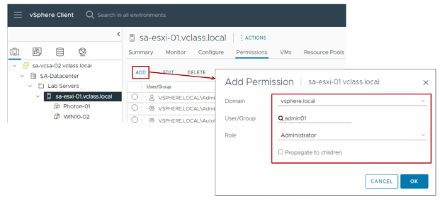 Par exemple, vous pouvez sélectionner un VM object, ajouter une permission qui donne le rôle Read-only au group 1 puis ajouter une seconde permission qui donne le rôle Administrator au user 2.