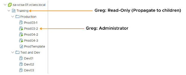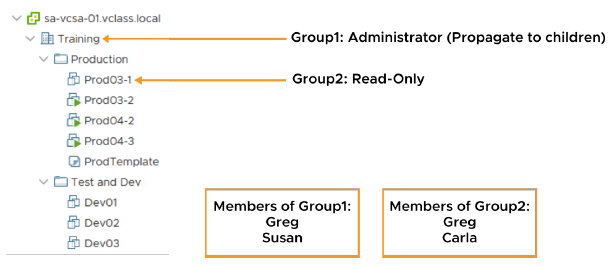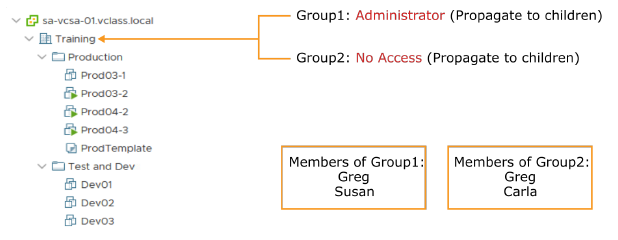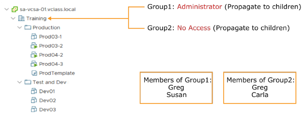 Greg est membre à la fois de Group1 et de Group2. Supposons que la propagation aux child objects soit activée pour tous les rôles. Bien que Greg soit membre à la fois de Group1 et de Group2, Greg reçoit le privilège No Access sur le Training data center et sur tous les objects qui en dépendent.