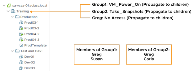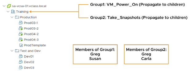 Comme Greg appartient à la fois à Group1 et à Group2, il obtient à la fois les privileges VM_Power_On et Take_Snapshots pour tous les objects du Training data center.