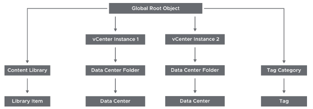 L’exemple montre que l’objet global root dispose de permissions sur tous les objets vCenter, y compris les content libraries, les instances de vCenter et les tags.