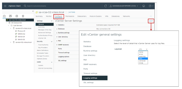 • Vous pouvez contrôler le vCenter logging level. Le changement du niveau de log affecte l’utilisation du filesystem de vCenter.