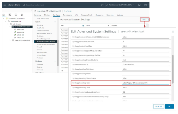 Pour les ESXi hosts, spécifiez le nom du serveur Syslog distant dans le volet Advanced System Settings du vSphere Client.